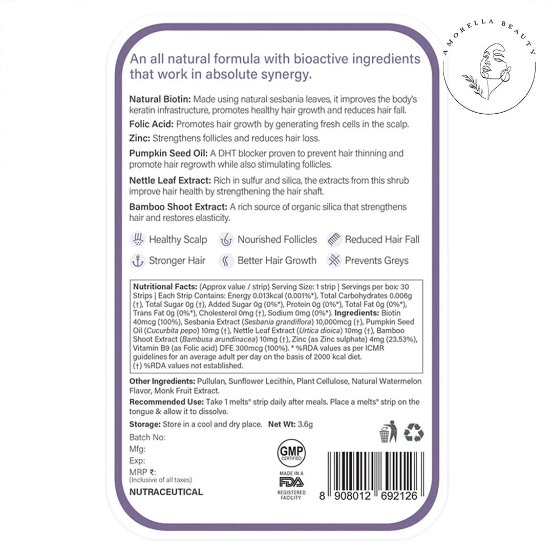 این ورقهها حاوی بیوتین طبیعی و عصارههای گیاهی هستند که با حمایت از ساختار کراتین، به تقویت فولیکولهای مو، کاهش شکنندگی، بهبود بافت و تقویت پیاز مو یاری میرسانند. مکانیسم بازشدن سریع این ورقهها روی زبان باعث میشود که مواد فعال با جذب بالا وارد جریان خون شوند و اثرگذاری بالاتری نسبت به قرصهای سنتی داشته باشند. فرمول ۱۰۰٪ گیاهی و بدون افزودنیهای مصنوعی این محصول آن را به انتخابی کارآمد برای افرادی تبدیل میکند که به دنبال راهحل مؤثر و ساده برای حمایت از سلامت مو هستند. ورقههای روزبانی نسبت به مکملهای مرسوم راحتتر مصرف میشوند و نیاز به آب ندارند، در نتیجه استفاده از آنها در برنامه روزانه آسان و بدون دردسر است.