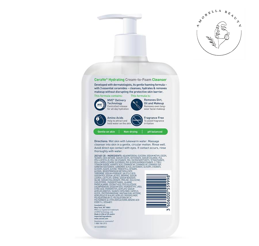 فرمولاسیون این فوم شستوشو با سرامید ضروری و هیالورونیک اسید به بازسازی سد طبیعی پوست کمک کرده و رطوبت را در لایههای پوست حفظ میکند. و فناوری MVE (آزادسازی تدریجی مواد فعال برای اثر طولانیمدت)، باعث میشود پوست حتی پس از شستشو برای مدت طولانی نرم و آبرسانی شده باقی بماند.