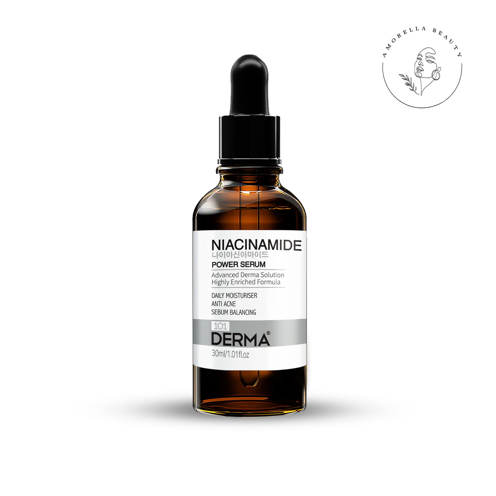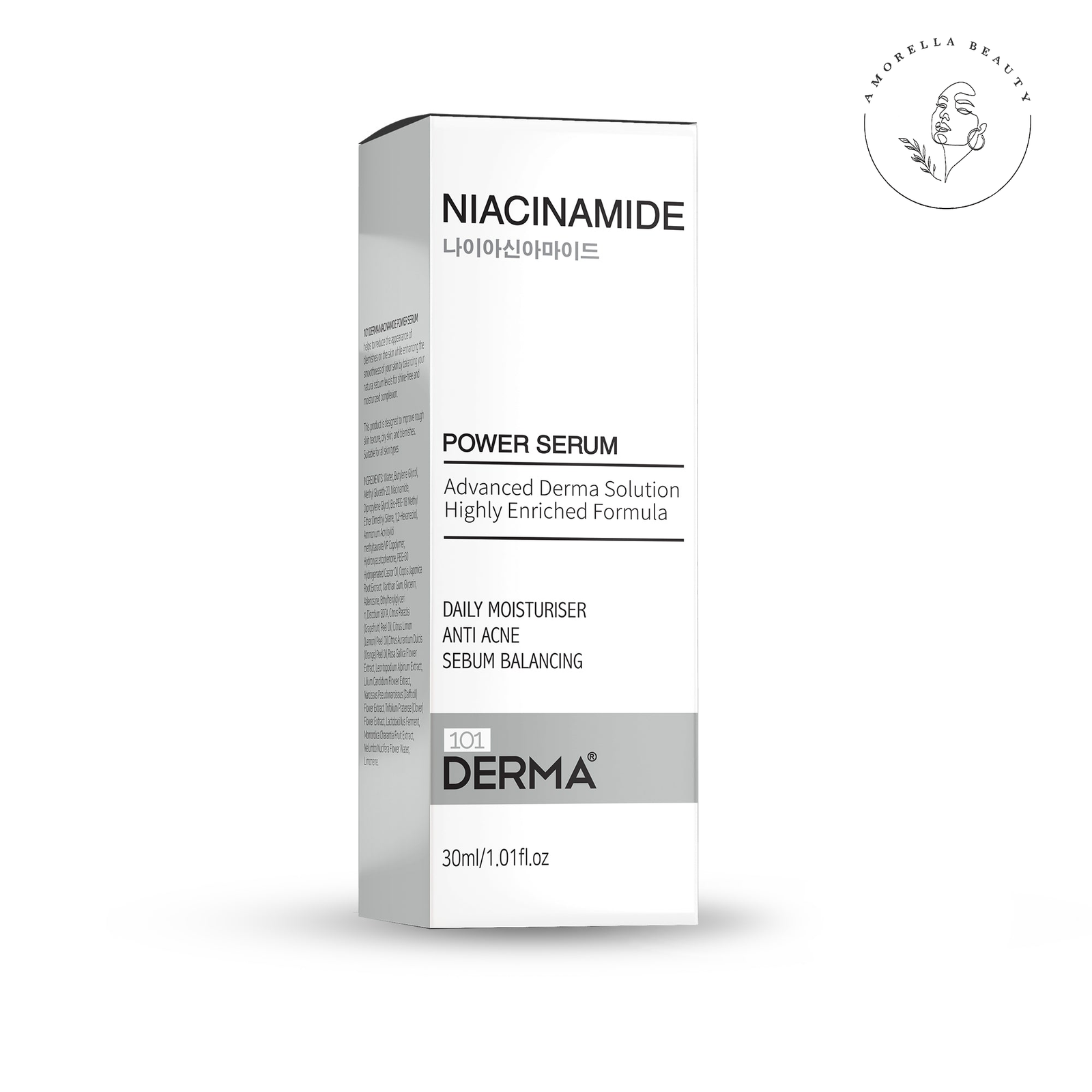 سرم ضدجوش و روشن کننده نیاسینامید۱۰۱درما حجم ۳۰ میل یک سرم مراقبتی روزانه است که با فرمولاسیون غنی از ۱۰درصد نیاسینامید طراحی شده تا به‌طور مؤثر به بهبود مشکلات پوستی از جمله جوش، چربی اضافی، ناهمواری بافت پوست و تیرگی کمک کند. این محصول با بافتی سبک، سریع‌الجذب و بدون ایجاد چربی روی پوست، منافذ باز را ظاهر کوچک‌تر نشان داده و در کنترل میزان سبوم نقش دارد. سرم نیاسینامید ۱۰۱درما علاوه بر بهبود التهاب و قرمزی، به روشن‌تر شدن تونالیته پوست، یکنواخت‌سازی رنگ چهره و کاهش لکه‌های پوستی کمک می‌کند.